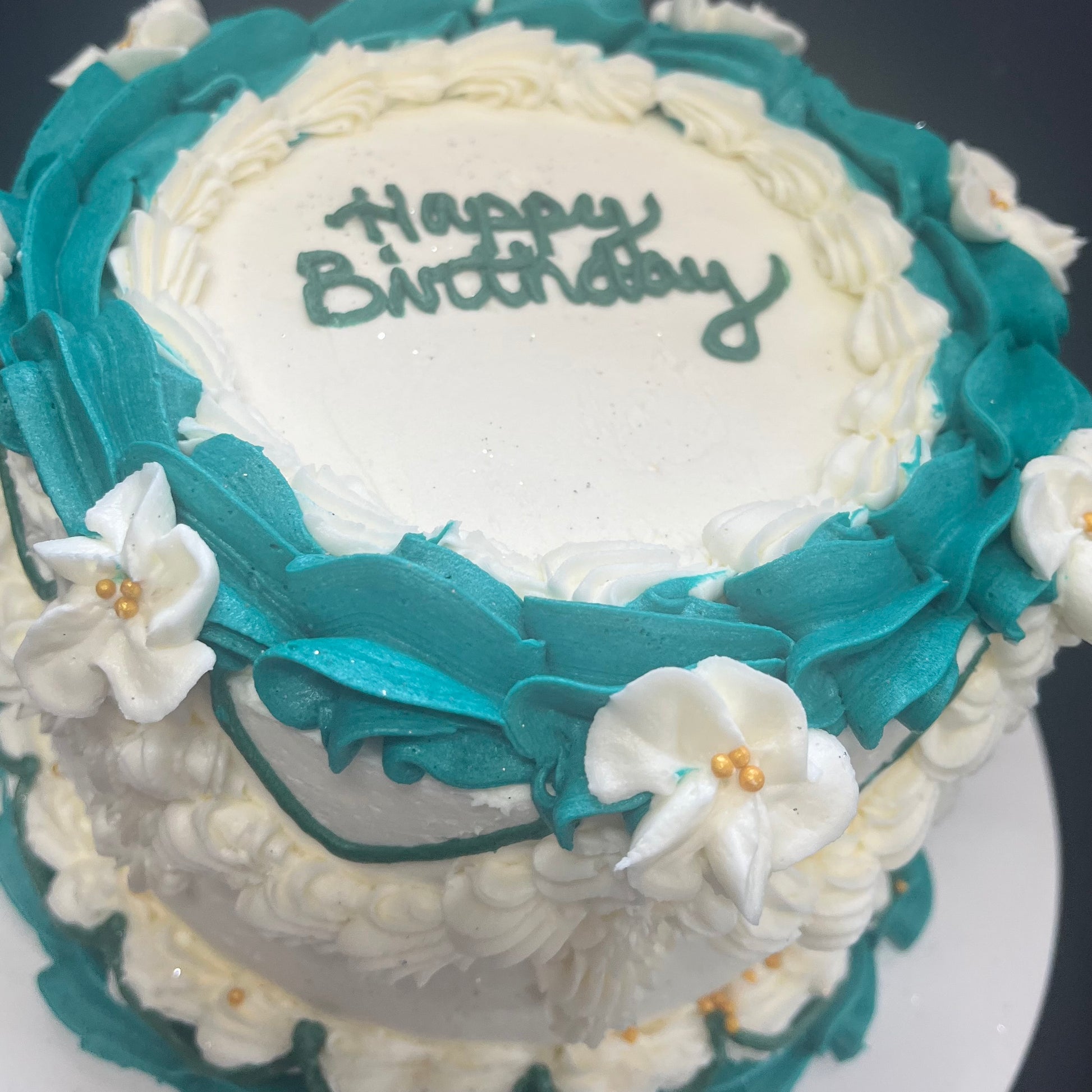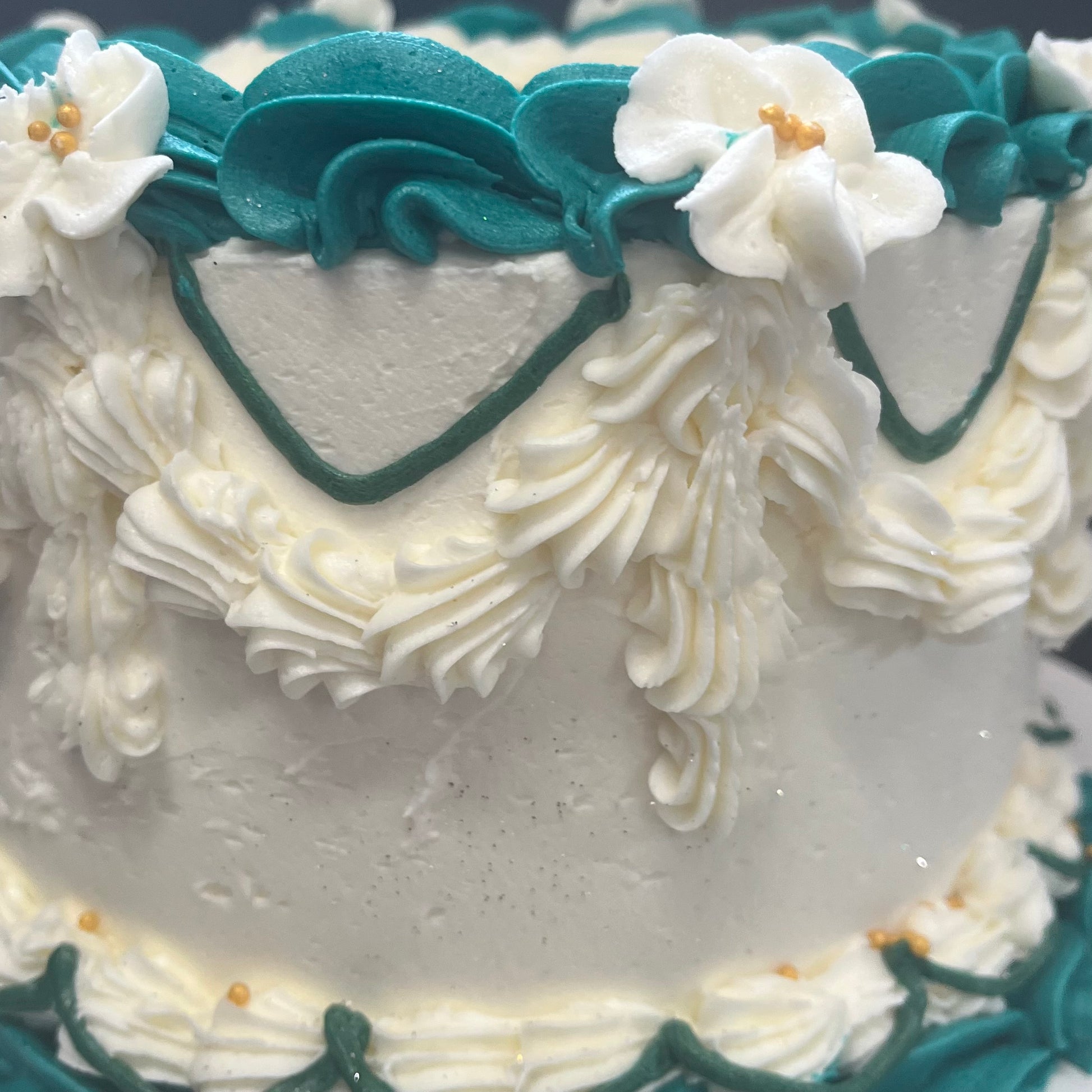 Vintage style decorated cake with piped buttercream daisy flowers and greenery